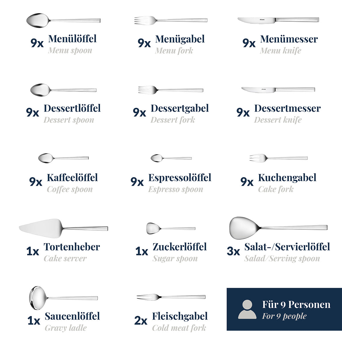 Das Set besteht aus je 9 Menülöffeln, Menügabeln, Menümessern, Dessertlöffeln, Dessertgabeln, Dessertmessern, Kaffeelöffeln, Espressolöffeln, Kuchengabeln sowie 3 Servierlöffeln, 2 Fleischgabeln, 1 Saucenlöffel, 1 Tortenheber und 1 Zuckerlöffel.