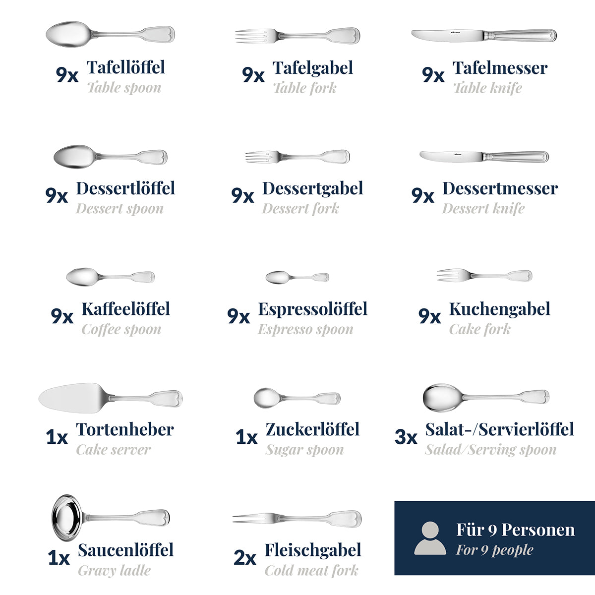 Besteckset besteht aus je 9 Tafelmessern, Tafelgabeln, Tafellöffeln, Tafelmessern, Dessertgabeln, Dessertlöffeln, Kaffeelöffeln, Espressolöffeln, Kuchengabeln sowie 3 Servierlöffeln, 2 Fleischgabeln, je 1 Tortenheber, Zuckerlöffel, Saucenlöffel.